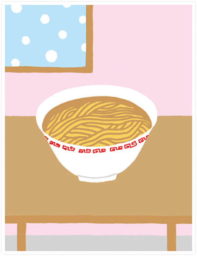 寒い雪の日。一人留守番をしています。お腹がすいてきたので、具なしの即席ラーメンを自分で作って食べる。淋しいけれど、一人でいる解放感もあって、まあ満足でした。本人が「最高」というのは、ちょっぴり強がりっぽいけれど。〈安西 篤〉