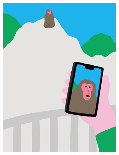 訳/ 動物園の展示 サルをスマホで見るヒトを サルがじっと見る