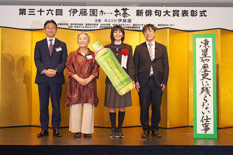(左から伊藤園 志田マーケティング本部長、夏井いつき氏、阿見さん、文部科学省 片見氏)