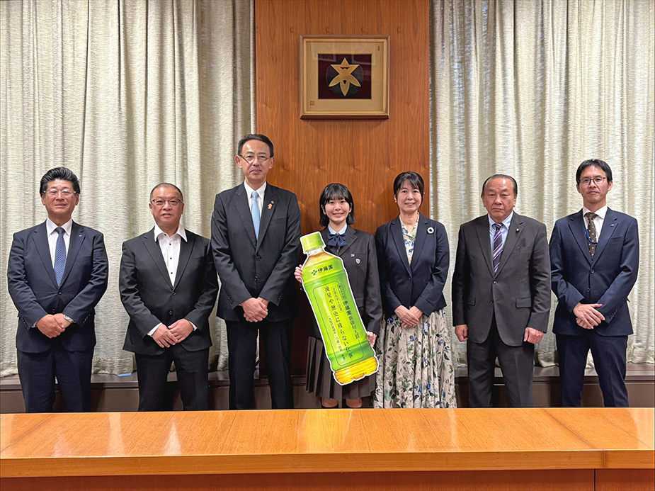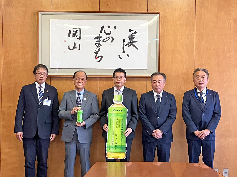 阿見さんのお母様、高槻市議会 久保議長、伊藤園寝屋川支店 小林支店長 岡山市役所への表敬訪問